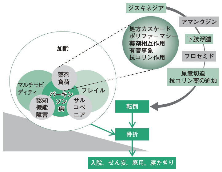 抗精神病薬による遅発性ジスキネジアやドパミン関連薬剤によるジスキネジアとなり,症状緩和のためアマンタジンを投与した結果,副作用で下肢浮腫が出現し,浮腫を改善するため利尿薬のフロセミドを使用すると尿意切迫となり,神経因性膀胱の診断で抗コリン薬の投与を行った結果,転倒・骨折するという悪循環に陥ります。
